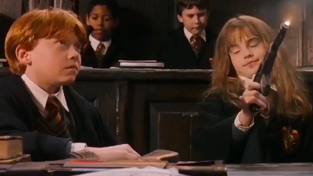 ¡Es Leviósa…. No Leviouusáá! En esta realidad alterna Hermione Granger (Emma Watson) demostró que no se necesita una varita para hacer levitar una pluma y seguramente Seamus (Devon Murray) no tendría problema al hacer explotar todo. Pero nos queda claro que el techo de Howgarts estará lleno de hoyos y de balas perdidas después de esto.